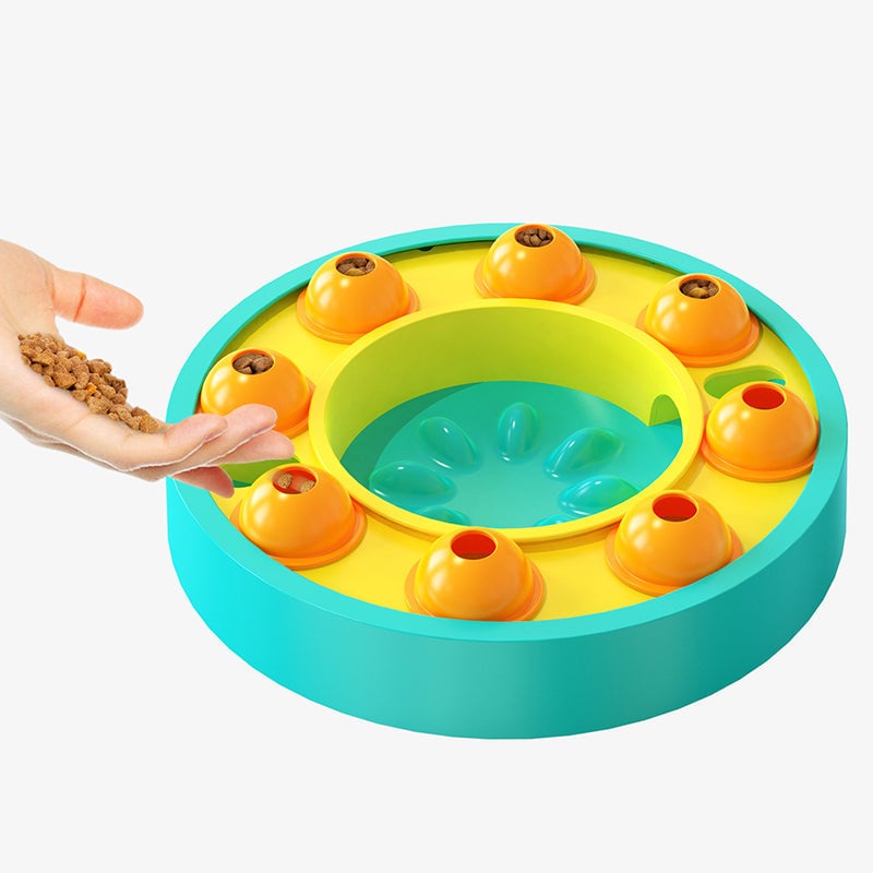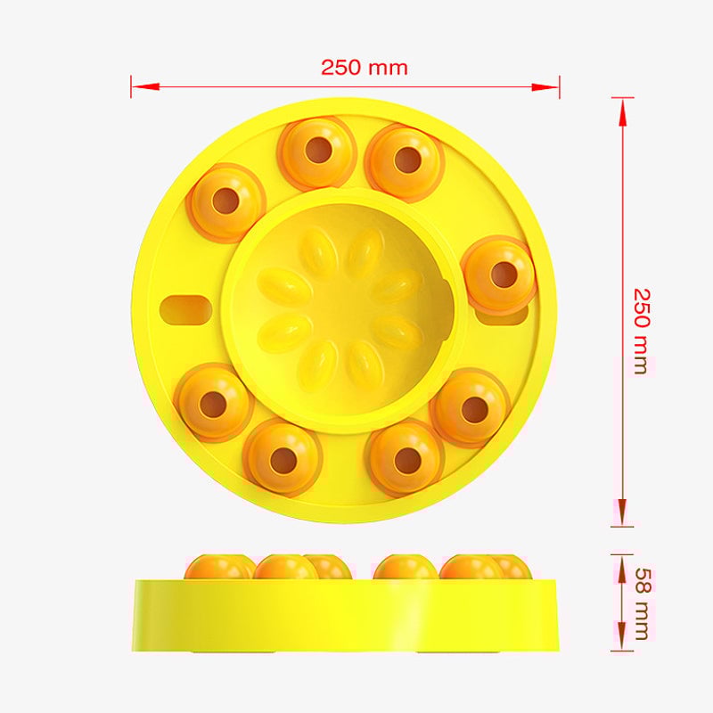 Platine mobile : Le dessus du jouet est équipé d'un plateau tournant avec plusieurs compartiments de céréales rotatifs. Vous pouvez y placer de la nourriture pour chiens ou des friandises, et le chien les fera tourner avec ses pattes. Lorsque la nourriture passe à travers les trous du rail, elle glisse dans la poêle au centre du jouet, récompensant ainsi le chien avec de la nourriture. Cela suscitera l'intérêt du chien pour jouer et améliorera son intelligence.
