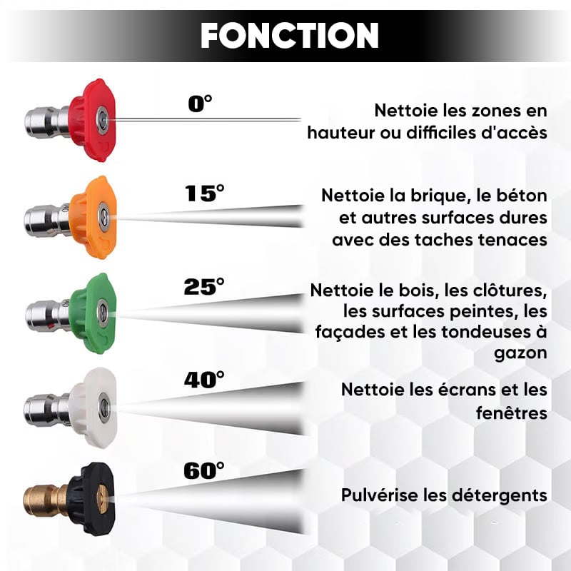 Alternez entre cinq buses différentes pour un contrôle total de votre nettoyage ! Avec des angles de 0° à 65°, vous pouvez personnaliser votre jet pour s’adapter à toutes les surfaces. Que ce soit un jet concentré pour les taches difficiles ou un jet large pour un nettoyage général, vous aurez la flexibilité nécessaire pour tout affronter.